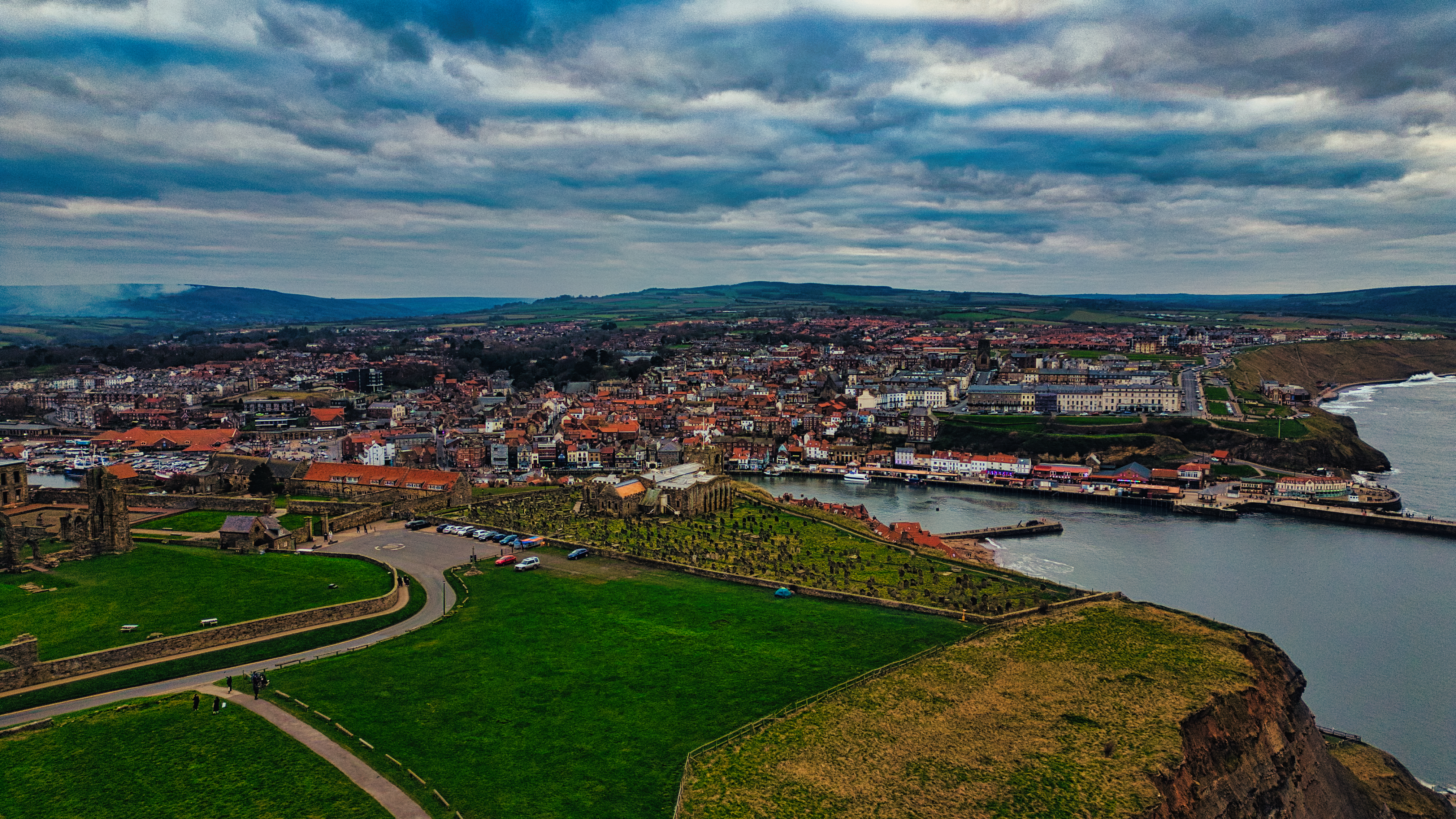 Aerial view of Whitby, UK with Abbey ruins, town, harbor, coastline, and cloudy sky. Green grass foreground.