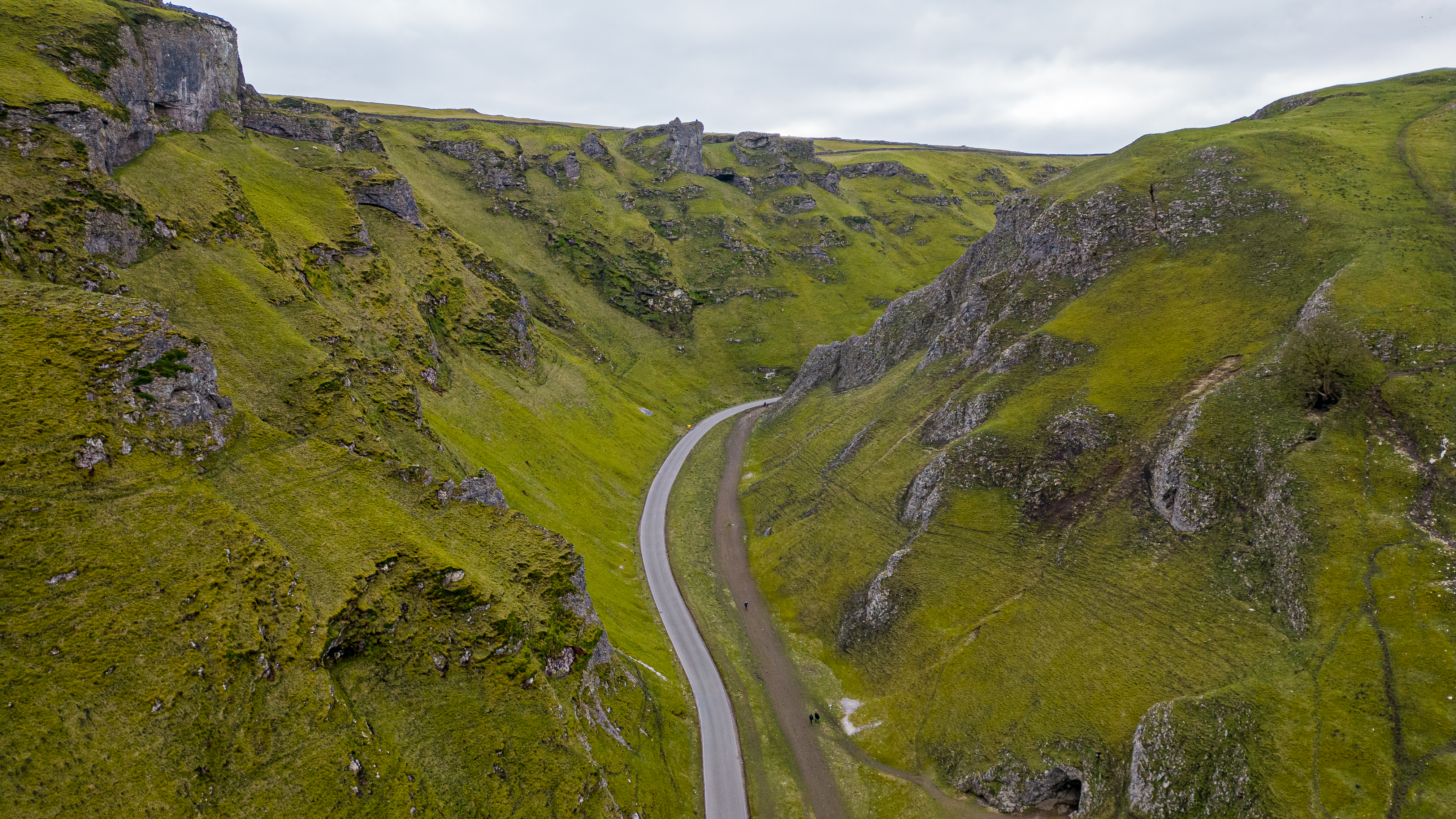 Winding road through a lush green valley with rocky cliffs under a cloudy sky in Peak District, England.