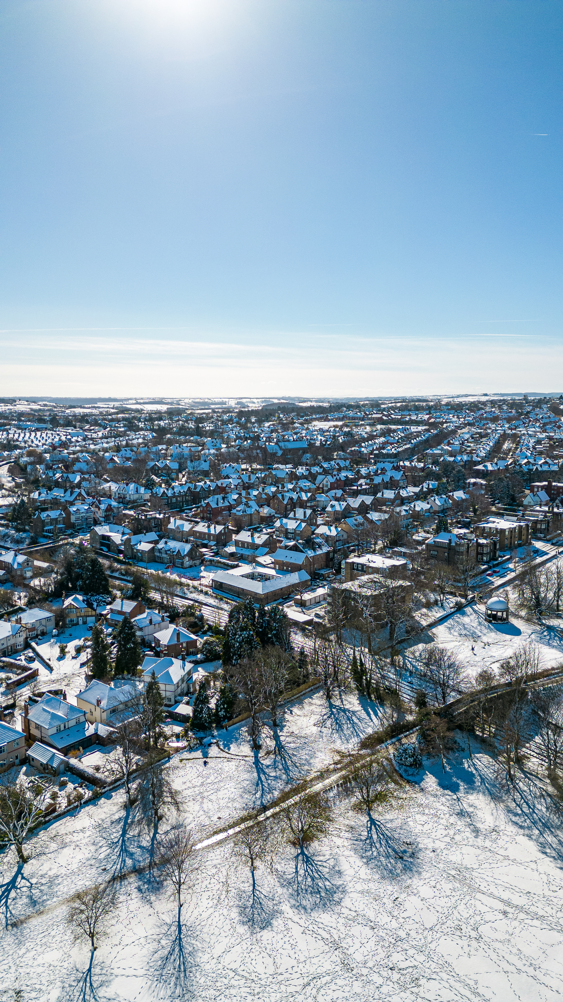 Winter aerial view of a suburban neighborhood with snow-covered houses and streets under a clear blue sky in Harrogate, North Yorkshire.