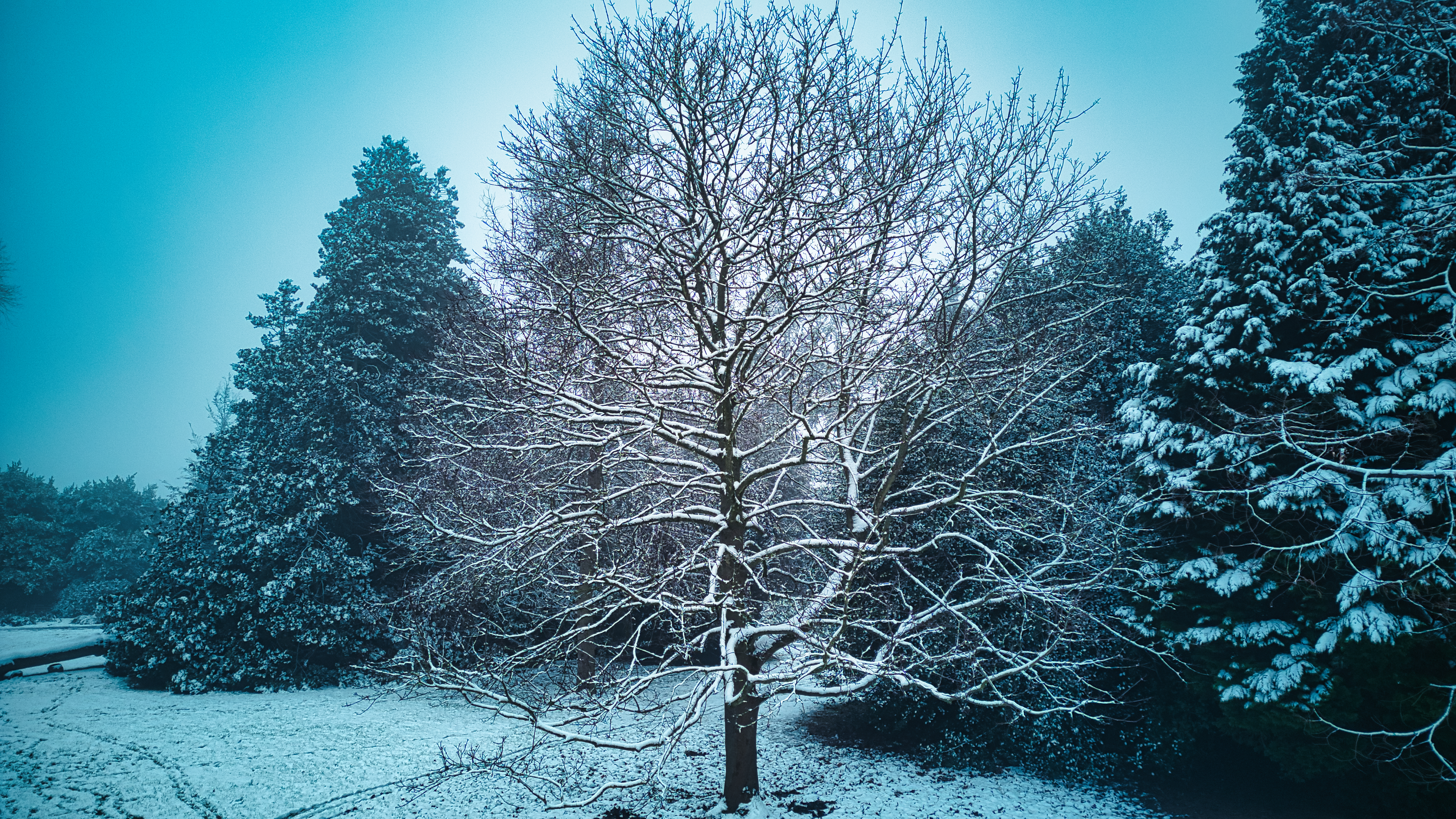Winter landscape with snow-covered trees and a tranquil atmosphere n Harrogate, North Yorkshire.