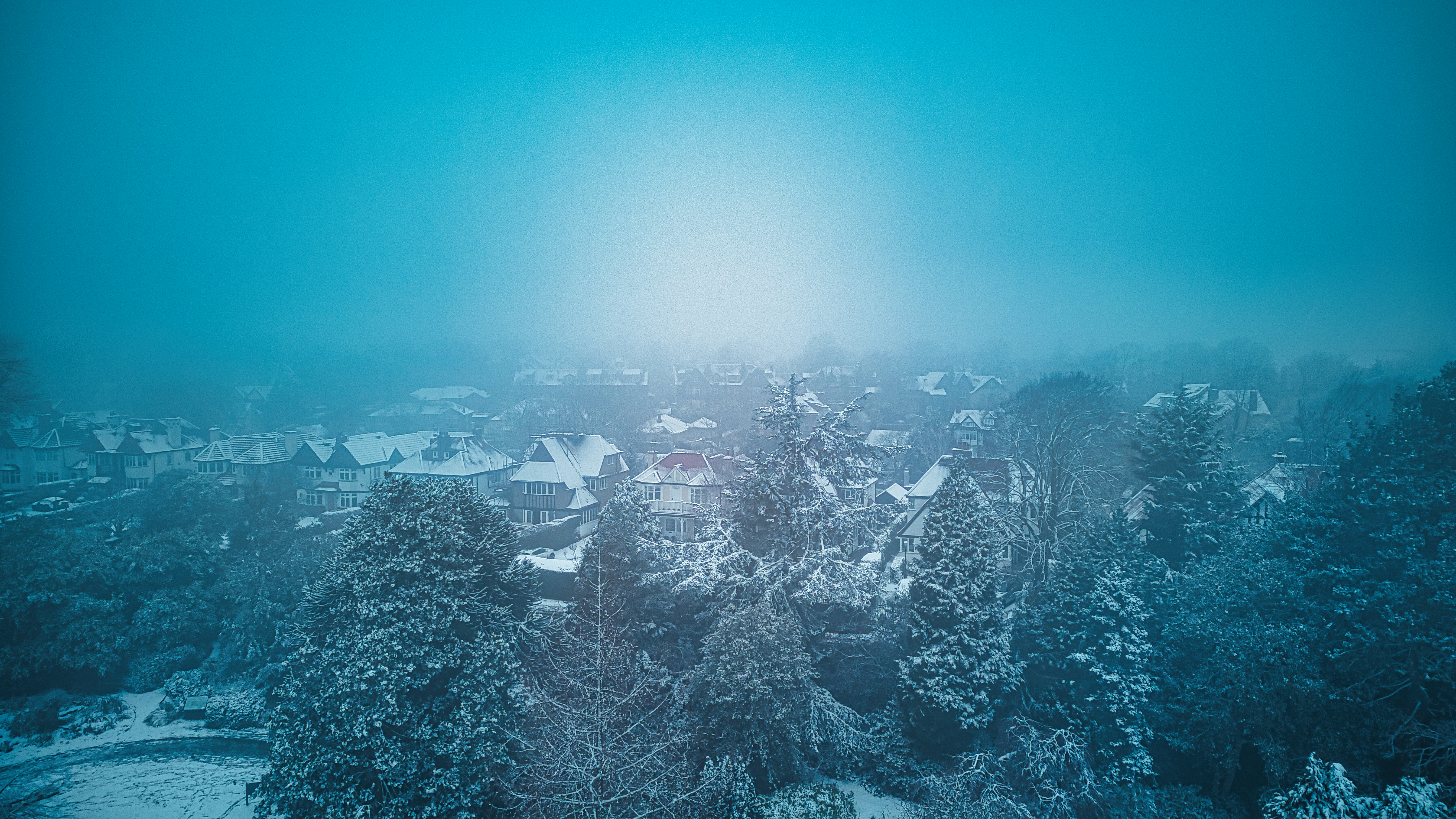 Winter landscape with snow-covered trees and houses during a snowstorm in Harrogate, North Yorkshire.