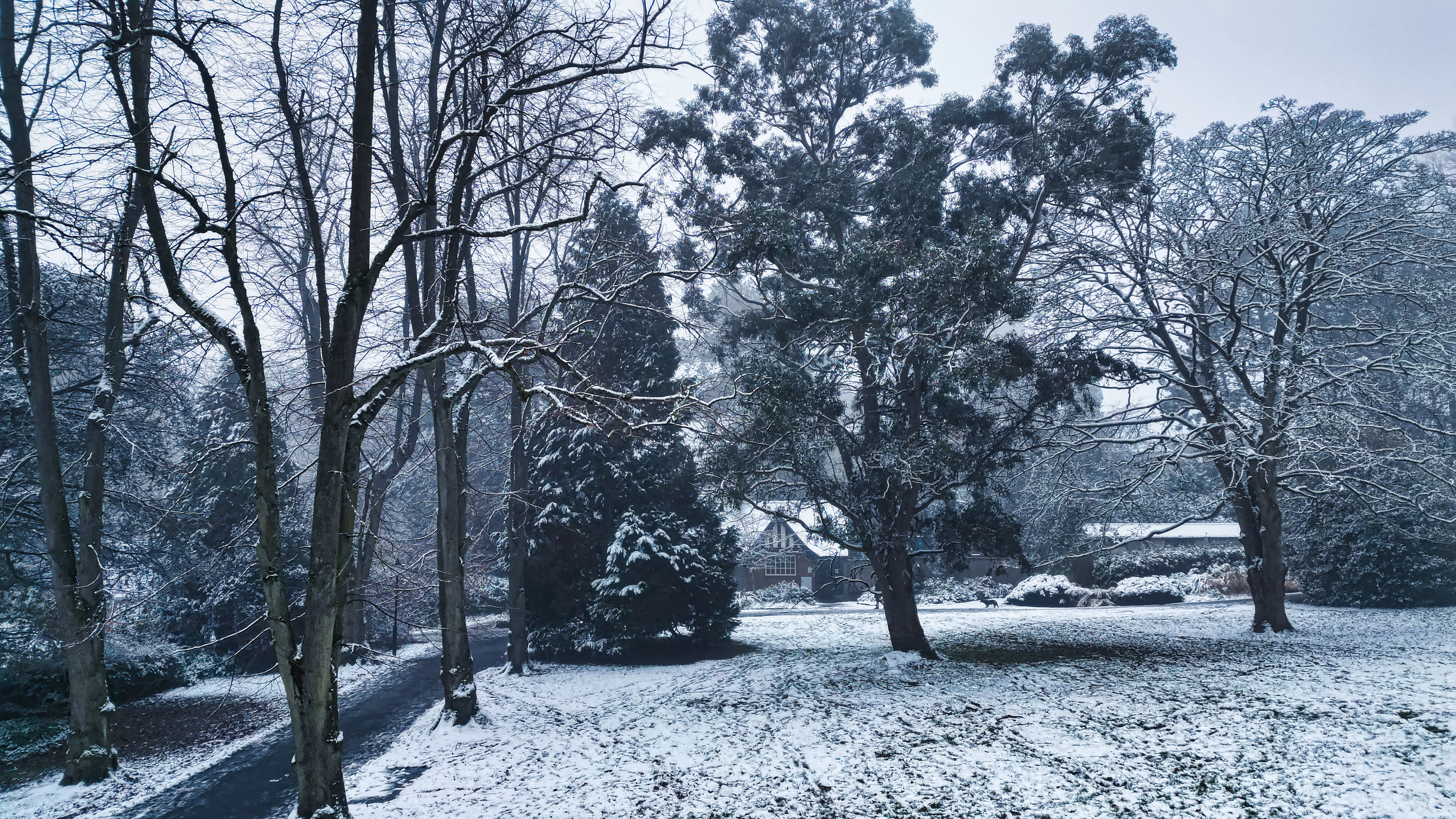 Winter scene with snow-covered trees and a tranquil park atmosphere n Harrogate, North Yorkshire.